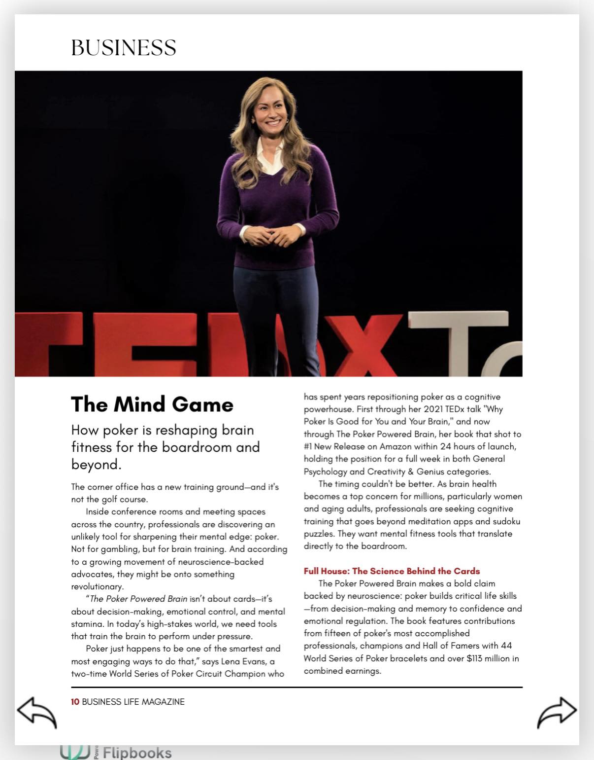 Published in Business Life, The Mind Game captures the evolution of Lena’s work as a speaker and author—examining how awareness, emotional discipline, and presence shape performance in poker, leadership, and life. These themes form the backbone of her keynote talks and ongoing presentations worldwide, where competition becomes a pathway to insight rather than dominance.